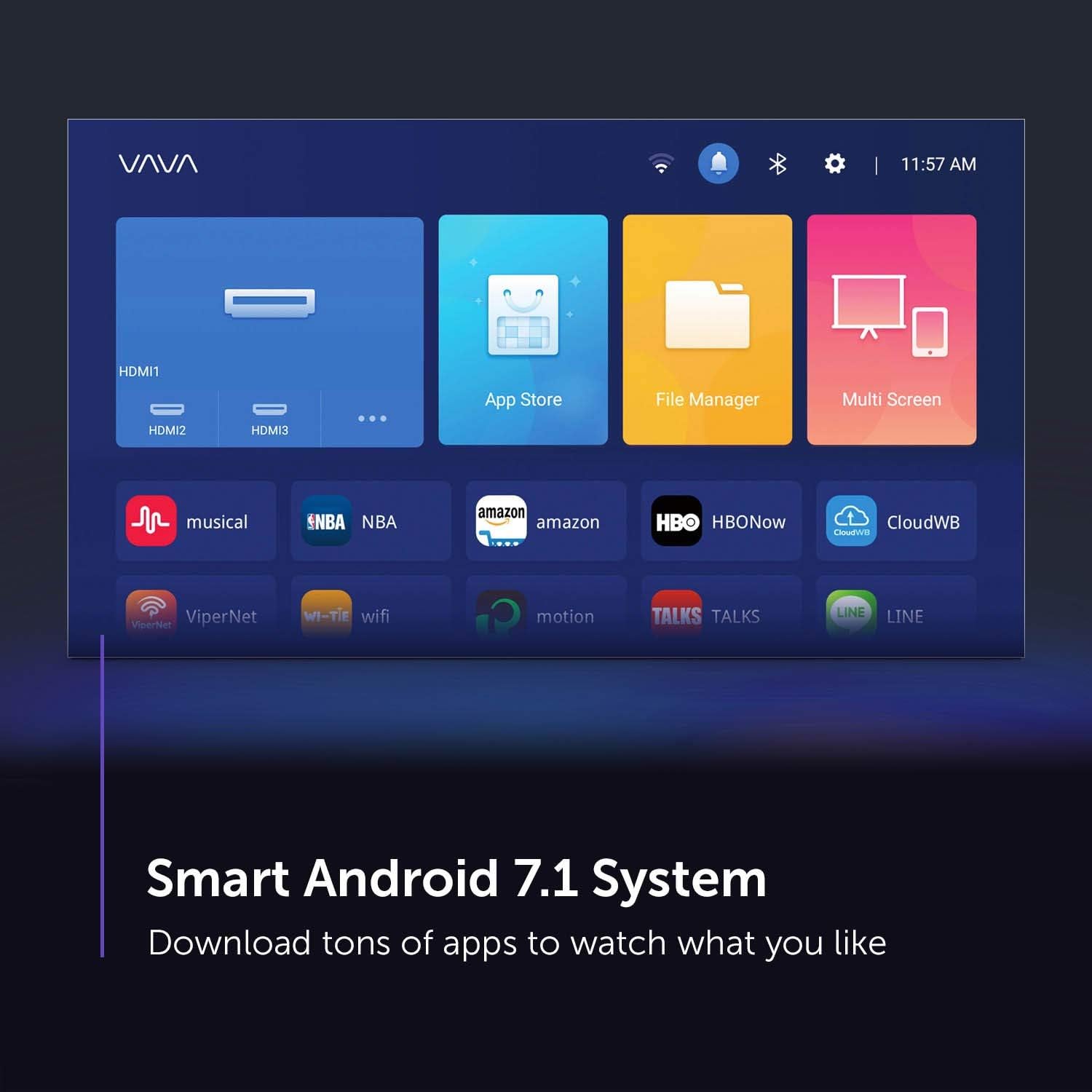 VAVA 4K Ultra Short Throw laser projector is a smart device based on the Android 7.1 OS. It allows you to install applications from the Aptoide store, which is an alternative Android marketplace. The interface is nice and clean and easy to navigate. There are four primary menu panels – a preview window, a shortcut to the Aptoide store, a link to the file manager for browsing attached USB storage, and a menu item for connecting mobile devices via the VAVA Projector App.