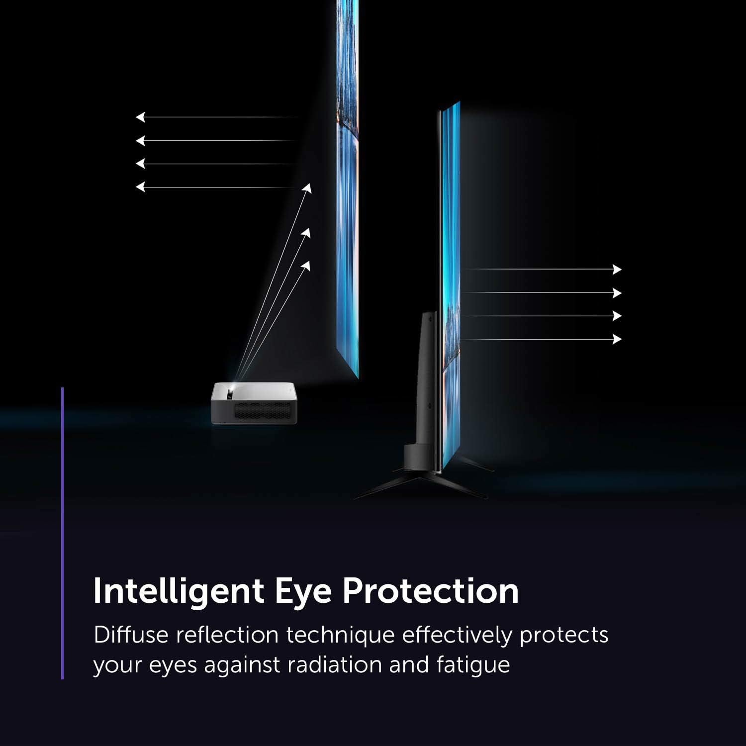 The projector has a throw ratio of 0.233:1 and can project a 100” image when placed at a distance of only 7.2” from the screen. You can use the projector to project 80” to 150” imagery. It has a resolution of 3840×2160 pixels and allows you to watch movies and videos in excellent quality. Although the resolution is not native 4K, you won’t notice any significant difference. There are Harman Kardon stereo speakers behind the gray fabric on the front side that provide decent audio quality. It supports a contrast ratio of 3,000:1 and produces vibrant images. The device comes with 2GB of RAM and an additional 32GB EMMC memory for storage.