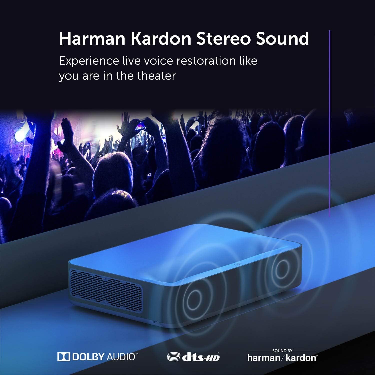 It comes with built-in Harmon Kardon stereo speakers that provide decent sound quality. It is loud enough for living rooms, but the lack of a dedicated subwoofer makes the low’s less punchy. However, it is expected and you can consider an external surround system for the full home theatre experience.